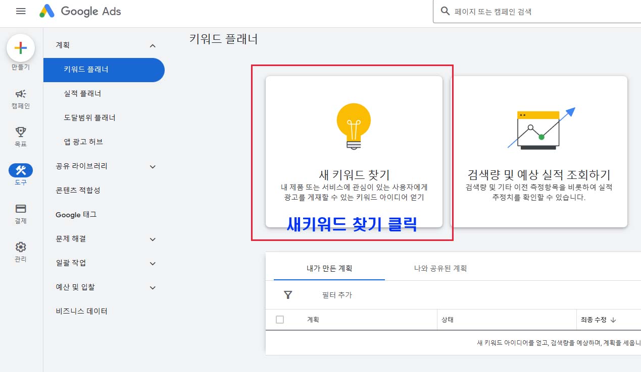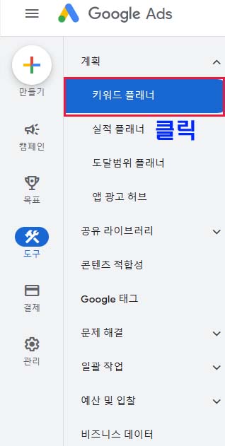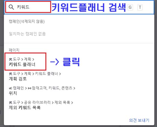 키워드플래너를 검색 그리고 클릭하는 것도 방법입니다.
