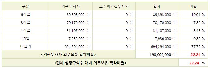 의무보유확약비율은 전체 신청주식수 대비 22.24% 기관투자자의 의무보유 확약비율은 높아서 긍정적입니다.