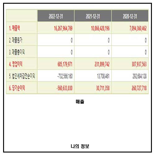 영업이익은 또한 2020년 3억,2021년 2억 3천, 2022년, 6억 8천만 원으로