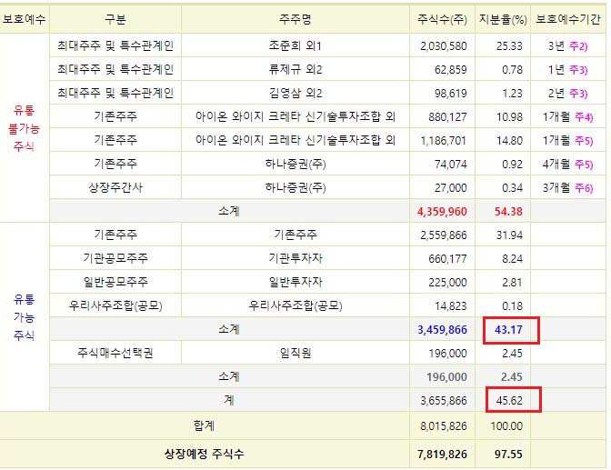 상장 당일 유통물량은 45.62% 약 365만 주입니다.