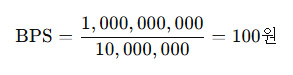 만약 한 기업의 총 순자산이 1,000억 원이고, 발행 주식수가 1,000만 주라면 주당순자산가치는 100원입니다.