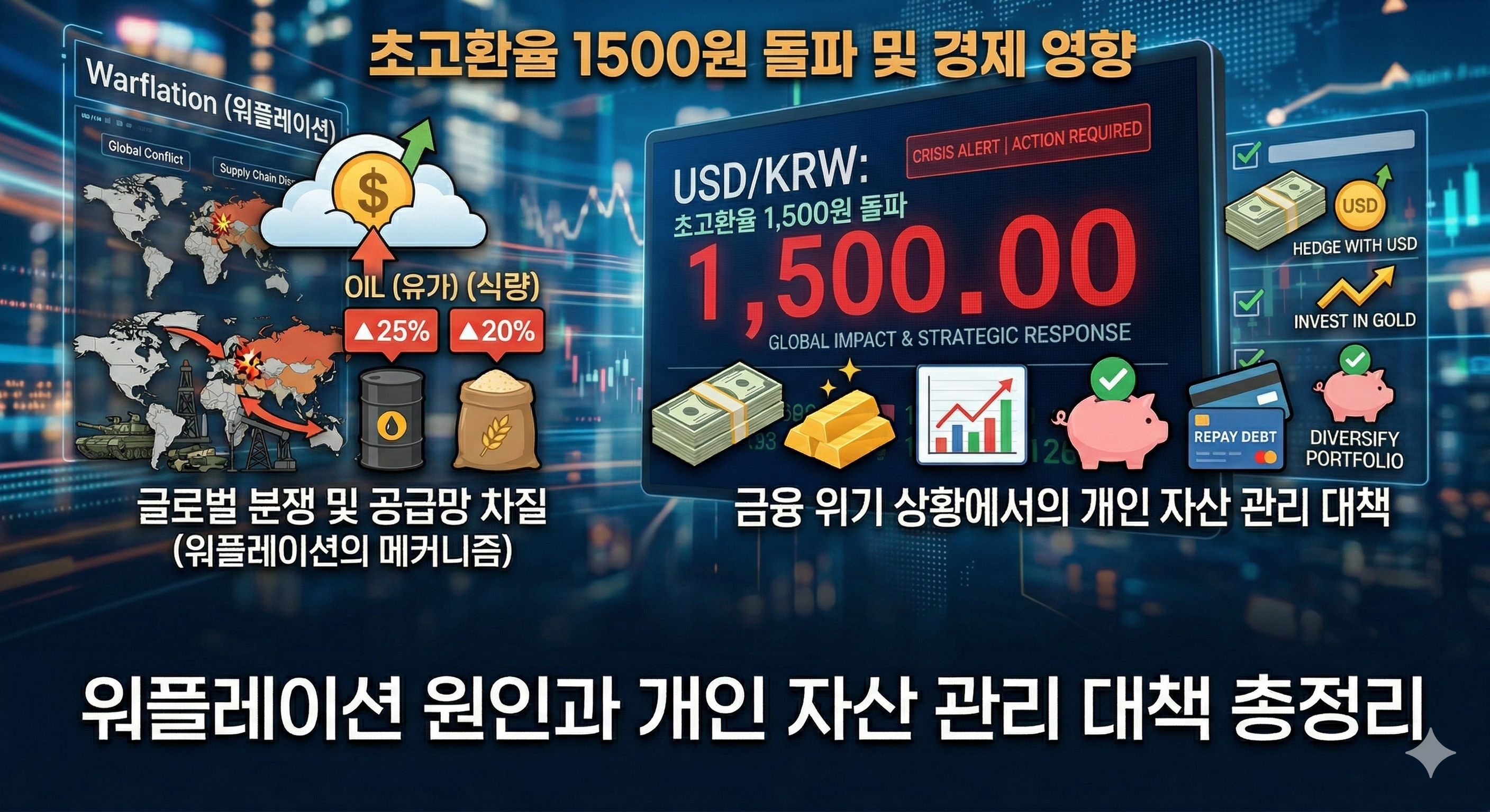 단순히 환율이 오른 것을 넘어, 글로벌 지정학적 위기가 촉발한 워플레이션(Warflation) 의 공포가 우리 집 밥상 물가까지 덮치고 있는 상황입니다. 오늘은 현재 경제 위기의 근본적인 원인을 진단하고, 이러한 초고환율 시대에 평범한 개인이 소중한 자산을 지켜내기 위한 맞춤형 생존 대책을 총정리해 보겠습니다.