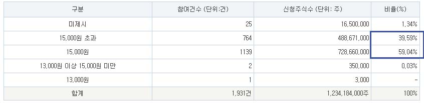 기관들은 대부분 공모희망가 상단인 1만 5천 원을 선택했습니다.