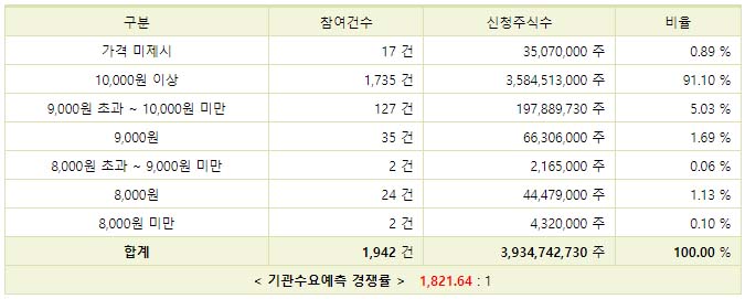 1,942건의 참여 1,821.64:1의 수요예측 결과가 나왔습니다.