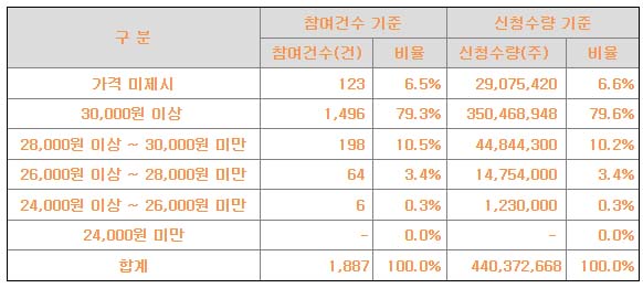 공모가 상단금액 이상이 거의 대부분을 차지하면서