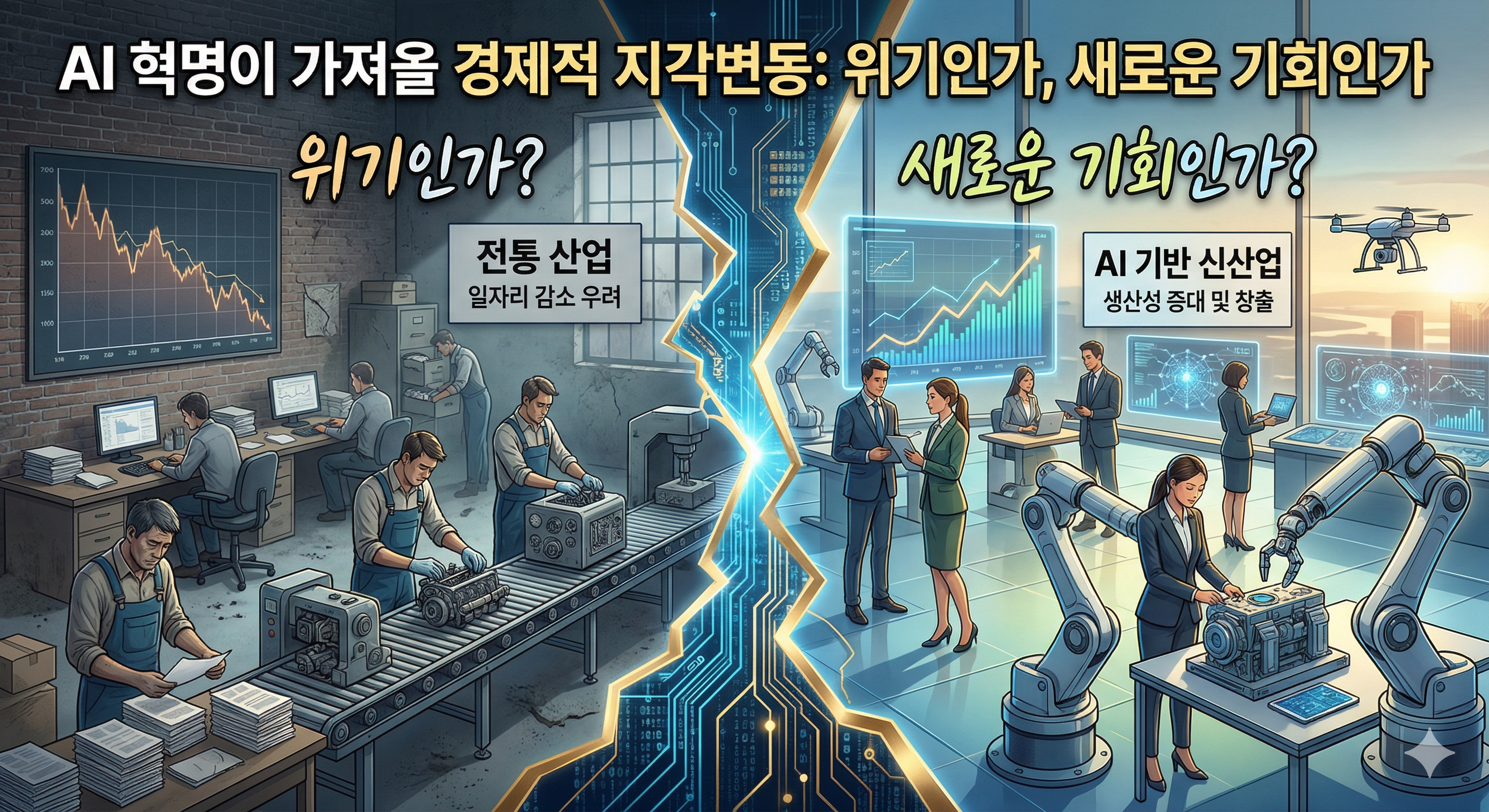 최근 챗GPT를 필두로 한 생성형 AI의 등장은 단순한 기술 발전을 넘어 우리 삶의 방식과 경제 구조 전체를 뒤흔들고 있습니다. 증권가에서는 'AI 수혜주' 찾기에 혈안이 되어 있고, 기업들은 생존을 위해 AI 도입을 서두르고 있죠. 하지만 동시에 '내 일자리가 사라지는 것은 아닐까?' 하는 막연한 공포도 공존하고 있습니다. 오늘은 AI가 가져올 노동 시장의 변화와 그로 인한 경제적 파급효과, 그리고 우리가 준비해야 할 자세에 대해 1,500자 분량으로 심도 있게 다뤄보겠습니다.